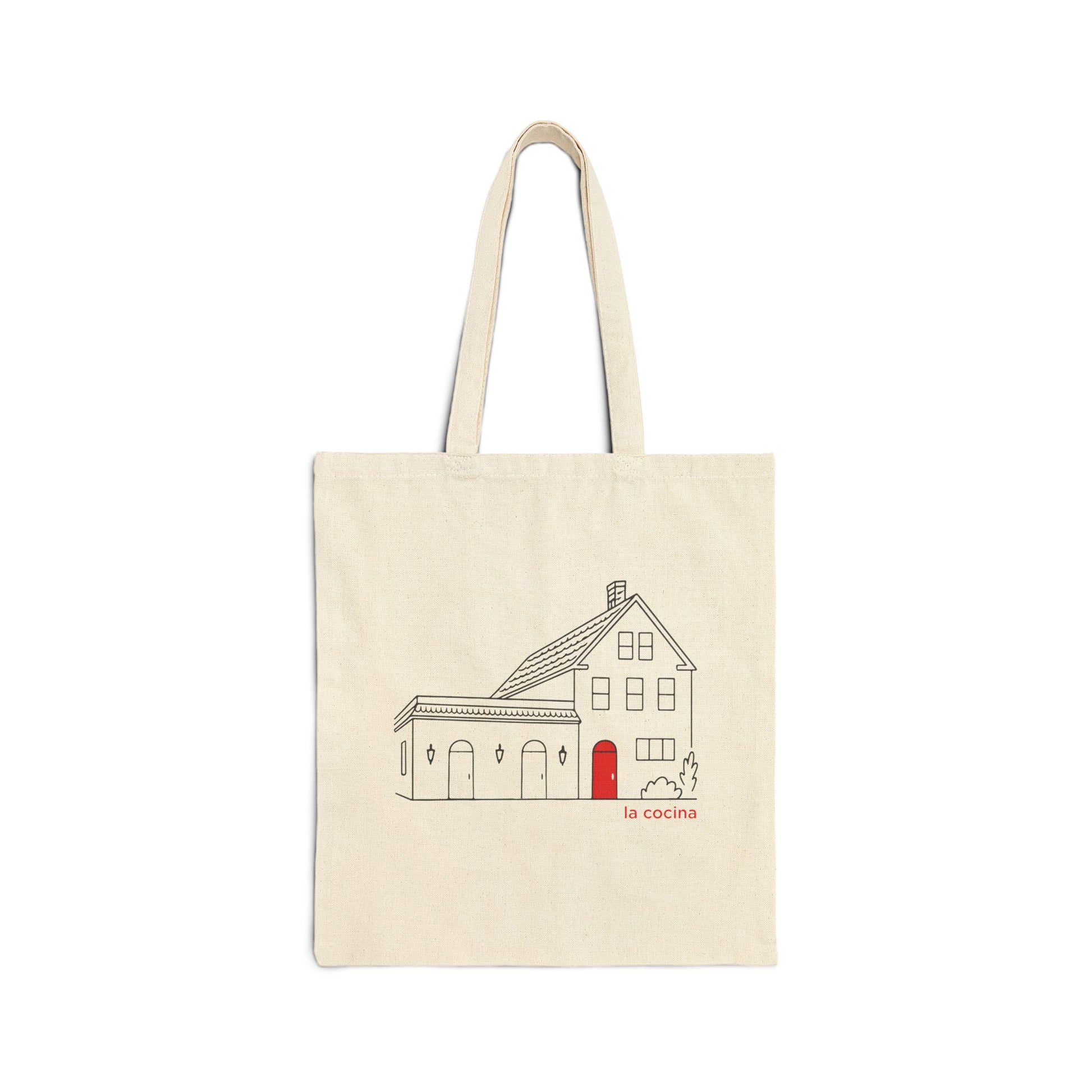 Soft natural fibers meet heavyweight construction so the bag holds books, groceries, or a laptop without sagging. The front print features a line-art illustration of La Cocina, the community soup kitchen that serves as a warm hub for nourishment and care. The simple architectural sketch gives the tote a humble, inviting feel that works for errands, volunteering, or daily carrying. Reinforced handles and flat corners help it sit neatly at your side and stay reliable through repeated use.